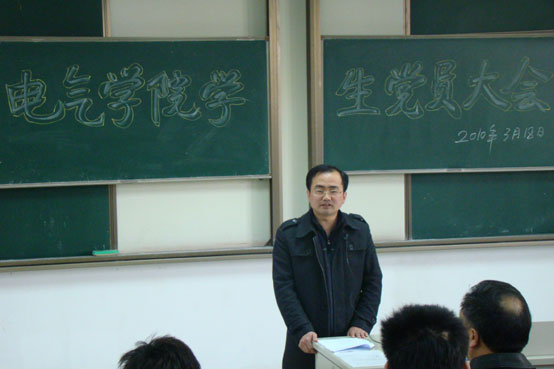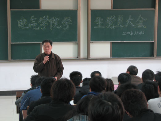 首先,电气学院党总支书记孙宪君教授对全院学生党员提出了要求,希望全院学生党员都能起模范带头作用,发扬学院优良传统,为学院的学风建设树立好榜样。接着,电气学院党总支副书记李云涛具体谈了三点意见,一、学生党员应如何发挥先进性作用;二、学生党员考核的程序和要求;三、对3月20日上午学生党员活动进行部署。