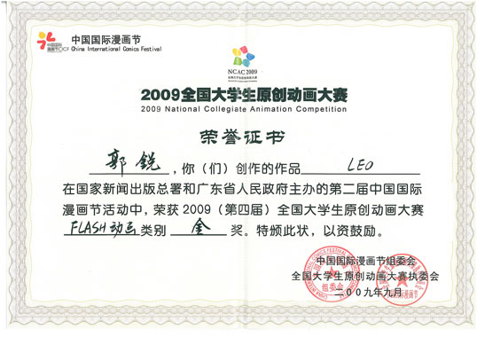 beat365在线唯一官网艺术学院05级二维动画专业郭锐同学的毕业设计作品《LEO》,在获得第三届全国数字艺术设计大赛江苏分赛区综合表现动画短片金奖后,再一次在国家新闻出版总署和广东省人民政府主办的第二届中国国际漫画节活动中荣获2009(第四届)全国大学生原创动画大赛FLASH动画类金奖。同时艺术学院邢小刚、张惠莉老师也获得2009(第四届)全国大学生原创动画大赛最佳指导教师奖。