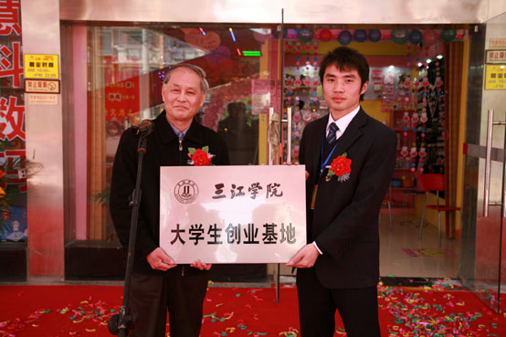王副校长与大学生创业者仲勇共捧“大学生创业基地”铜牌