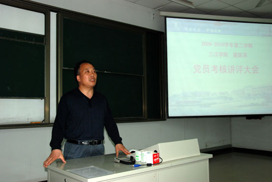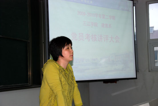 为了进一步推进建筑系学生党建工作,帮助学生党员充分发挥先锋模范作用,教育学生党员及入党积极分子更好地向优秀共产党员的目标努力,建筑系党总支于2010年5月17日,在4403教室召开了党员考核讲评大会。建筑系包括学生党员、发展对象、入党积极分子在内的近100名学生参加了此次会议。党委组织部兼学工部副部长卢启发老师,系党总支书记殷珊老师在会议上做了重要讲话,会议由系党 总支副书记陈荣桂老师主持。