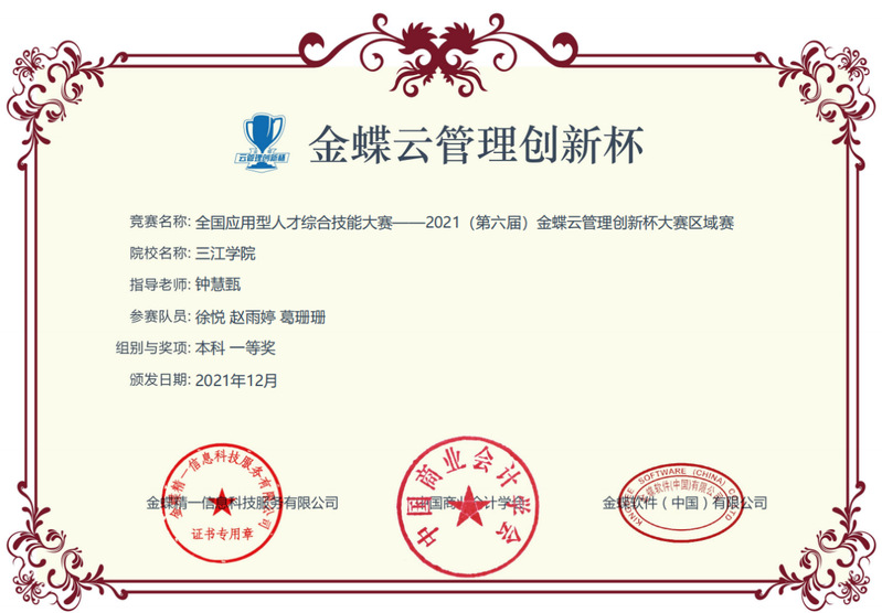 近日,由中国商业会计学会主办的2021(第六届)金蝶云管理创新杯大赛江苏赛区的区域赛圆满落幕。经过三位老师和九名学生的不懈努力,beat365在线唯一官网的三支代表队伍在众多竞赛队伍中脱颖而出。由钟慧甄老师指导的两组19级物流管理专业学生旋风队(徐悦、赵雨婷、葛珊珊)、小羊星队(张可欣、刘晓雯、李杨)分别获得江苏省一等奖和三等奖,由孙燕老师和袁伟东老师指导的会计专业学生拼搏队(关光名、汪旭辉、熊家龙)荣获江苏省二等奖。钟慧甄老师、孙燕老师以及袁伟东老师均获得“优秀指导教师”奖。值得一提的是,尽管物流管理专业的学生是第一次参加金蝶云大赛,但在此次竞赛中旋风队获得江苏省赛区第一名的好成绩,也获得了2022年上半年参与全国金蝶云管理创新杯大赛总决赛资格。