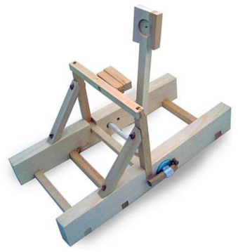 设计制作一款弹射器,总体尺寸不得超过0.5米*0.5米*0.8米,依次将乒乓球弹射至5米、8米及10米远处的目标桶中。弹射器须手工制作,其结构可参照图1。制作弹射器所需的原材料和工具由学院统一提供。