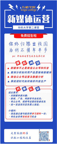 随着抖音号、头条号、微信公众号等自媒体号的兴起,新媒体领域越来越受到企业和媒体从业者的关注,为引导和支持对新媒体方向有浓厚兴趣的学生积极参加创新创业活动,提升创业能力和就业实力,现学校联合五格学院(南京),面向全校学生开展2019第一期“新媒体运营”集训营活动。有关集训营活动内容和报名须知如下。