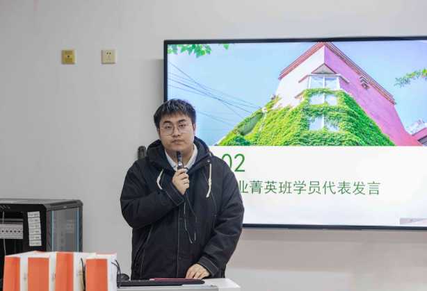 其次,学员代表沈艺同学表达了对学校各级领导与老师们倾力支持的感谢,并代全体学员承诺:在为期两个月的学习内,他们会努力学习、提升自我;在实现自我价值的同时,为团队带来增益。他非常认同团队对于创业的重要意义,并相信菁英班的学员们终会以“团结”之名,结出累累成功之硕果。最后,他对菁英班成功举办送上美好祝愿。