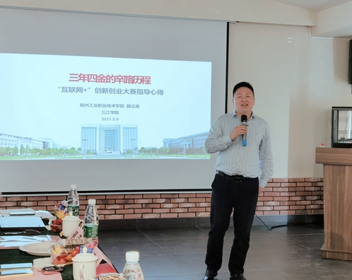 扬州工业职业技术学院创业学院院长颜正英以题为《三年四金的辛路历程、“互联网+”创新创业大赛指导心得》的报告分享了扬州工业职业技术学院创新创业学院的基本情况、“厚植文化底蕴 精湛一技之长”的育人理念、“六条星光大道”育人平台及创新创业实践开展情况等。他以第四届中国“互联网+”大学生创新创业大赛总决赛金奖项目《90后女孩有点“田”》为例,讲解了大赛参赛在项目的挖掘过程、培育措施、资源整合及项目打磨等方面的技巧和注意事项。