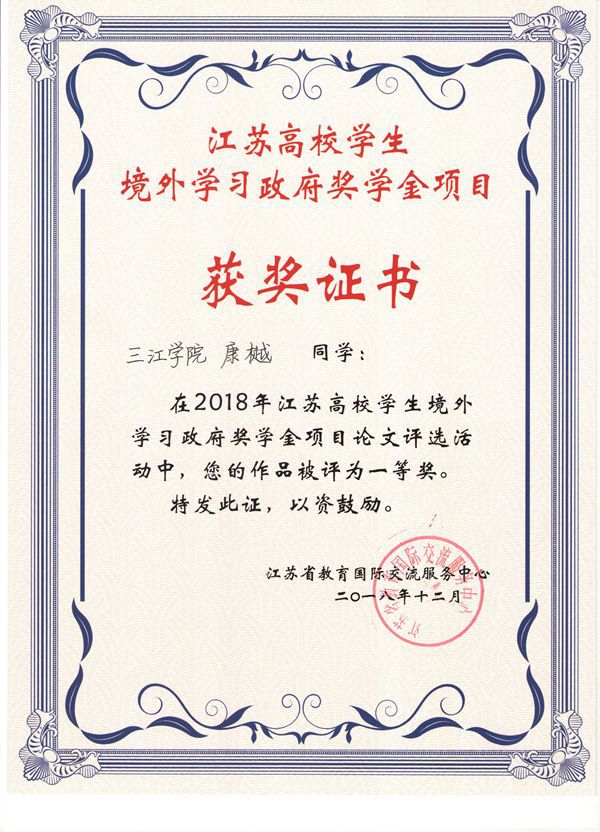 beat365官网学生康樾在2018年江苏高校学生境外学习 政府奖学金项目论文评选活动中荣获一等奖