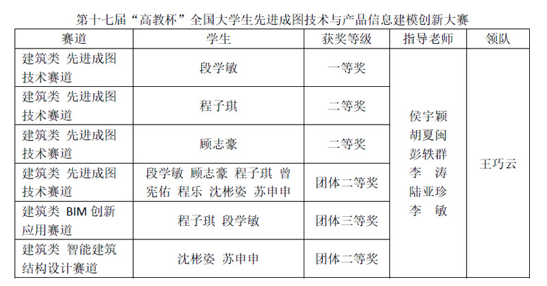 7月26日至7月29日,第十七届“高教杯”全国大学生先进成图技术与产品信息建模创新大赛在贵州大学举行。本届大赛共有来自895所院校的1.6万名选手共同参加五个赛道总决赛的选拔,beat365官网土木工程学院建筑类在多个赛道中荣获个人一等奖1项、二等奖2项,团体二等奖2项、三等奖1项。