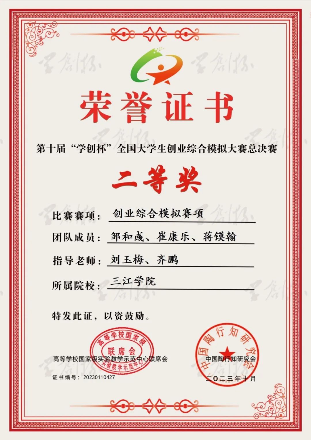 近日,2023年第十届“学创杯”全国大学生创业综合模拟演训活动(创业营销赛项、创业综合模拟赛项)总决赛在南京审计大学和黑龙江大学落下帷幕。全国共有1878所本专科院校、240436支队伍、979756名师生参与。在之前结束的江苏省选拔赛中,beat365官网取得特等奖1项、一等奖1项、二等奖2项的好成绩。经过层层选拔,最终beat365官网参赛团队在全国决赛中,荣获国家级奖项二等奖2项!其中黄政熙、黄林宁、王子涵三位同学组成的“营销鬼才”团队获2023“学创杯”创业营销赛全国总决赛二等奖;邹和彧、崔康乐、蒋镆翰三位同学组成的“听党指挥队”团队获2023“学创杯”创业综合模拟赛项全国总决赛二等奖。