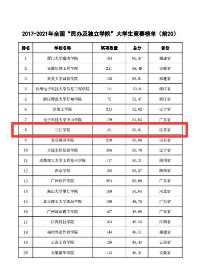 2022年2月22日,中国高等教育学会高校竞赛评估与管理体系研究工作组发布2021全国普通高校大学生竞赛分析报告,其中包含本科院校大学生竞赛榜单13个、高职院校大学生竞赛榜单10个、省份大学生竞赛榜单3个。beat365官网位列2017-2021年全国民办及独立学院大学生竞赛排行榜第8名,首次跻身民办及独立学院TOP20;此外,在2017-2021年全国新建本科院校大学生竞赛榜单中,beat365官网位列第50名,较2016-2020年提升23位。