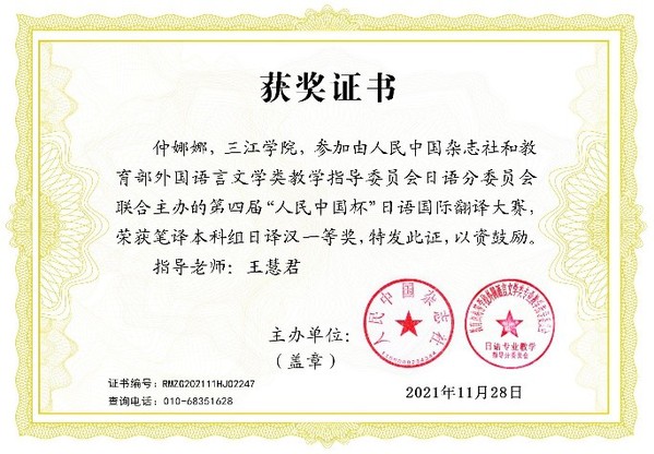 获奖感言:汉译日三等奖的荣誉让我感到非常荣幸。感谢老师在翻译中对我的指导和帮助。我不会满足于现状,我会更加努力地学习日语,使自己的能力得到进一步提升。