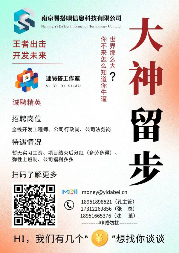 附:南京易搭呗信息科技有限公司(速易搭工作室)招聘啦!