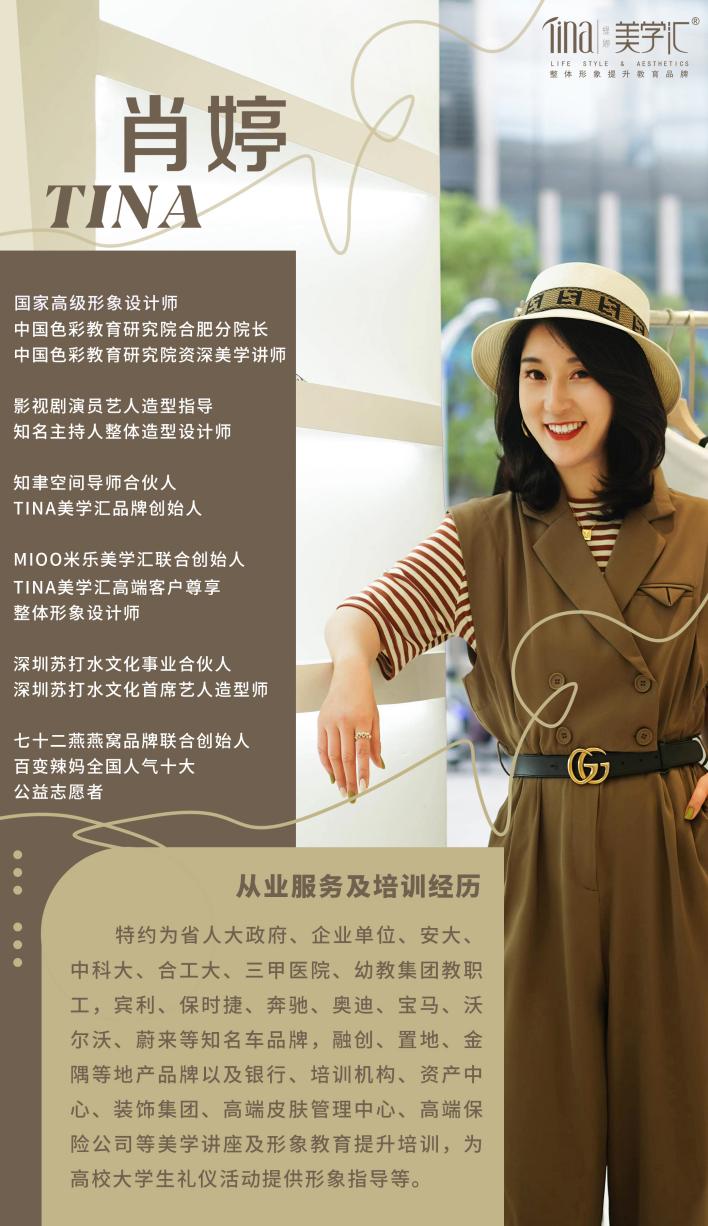 国家高级形象设计、影视剧组演员艺人整体造型指导、TINA美学汇创始人、中国色彩教育研究院合肥分院院长、中国色彩教育研究院资深美学讲师