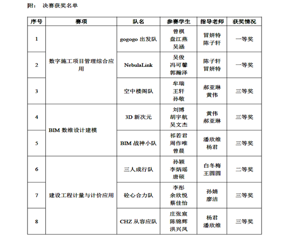 近年来,学院持续推进的“赛教融合”人才培养模式改革,实施“以赛促学、以赛促教”政策,通过组建高水平指导教师团队、搭建数字建筑实训平台等举措,为学生参与高水平竞赛提供了有力保障。未来,学院将继续深化改革,强化数字建筑技术与工程管理的交叉融合,提升学生的综合实践能力与创新竞争力,为培养适应行业发展的复合型人才奠定坚实基础。